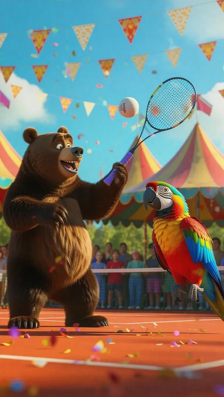 In a vibrant carnival sports arena, a bear and a parrot are engaged in a friendly game of badminton. The bear's power assists it in making strong serves, while the parrot's speed allows it to dive and catch the shuttlecock. The festive carnival backdrop enhances the spirit of the game between the bear and parrot.