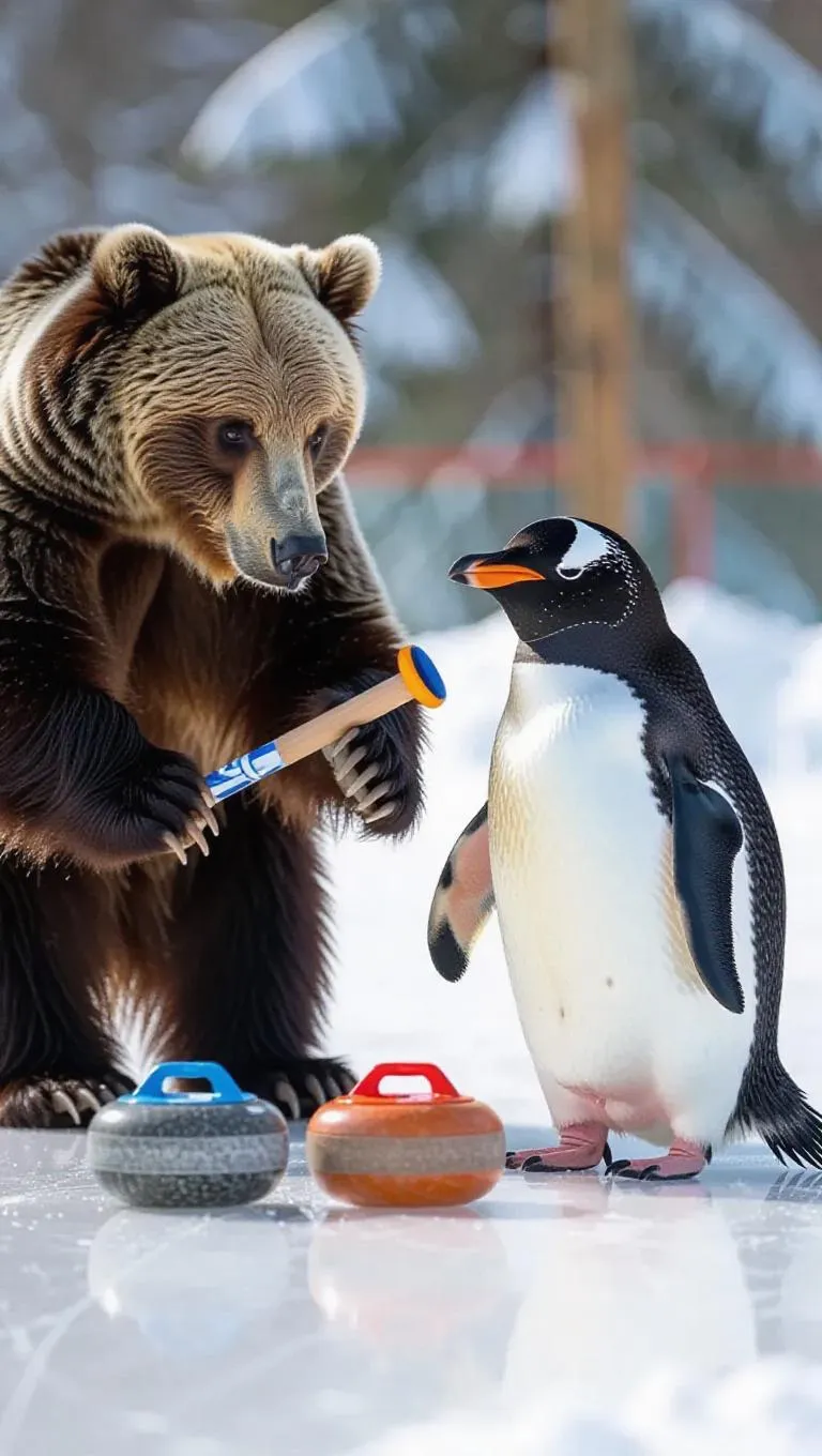 In a cozy winter sports arena, a bear and a penguin are engaging in a friendly game of curling. The bear’s powerful throws allow for great precision, while the penguin’s slick movements help in sliding stones. The inviting snowy setting enhances the camaraderie of the game between the bear and penguin.
