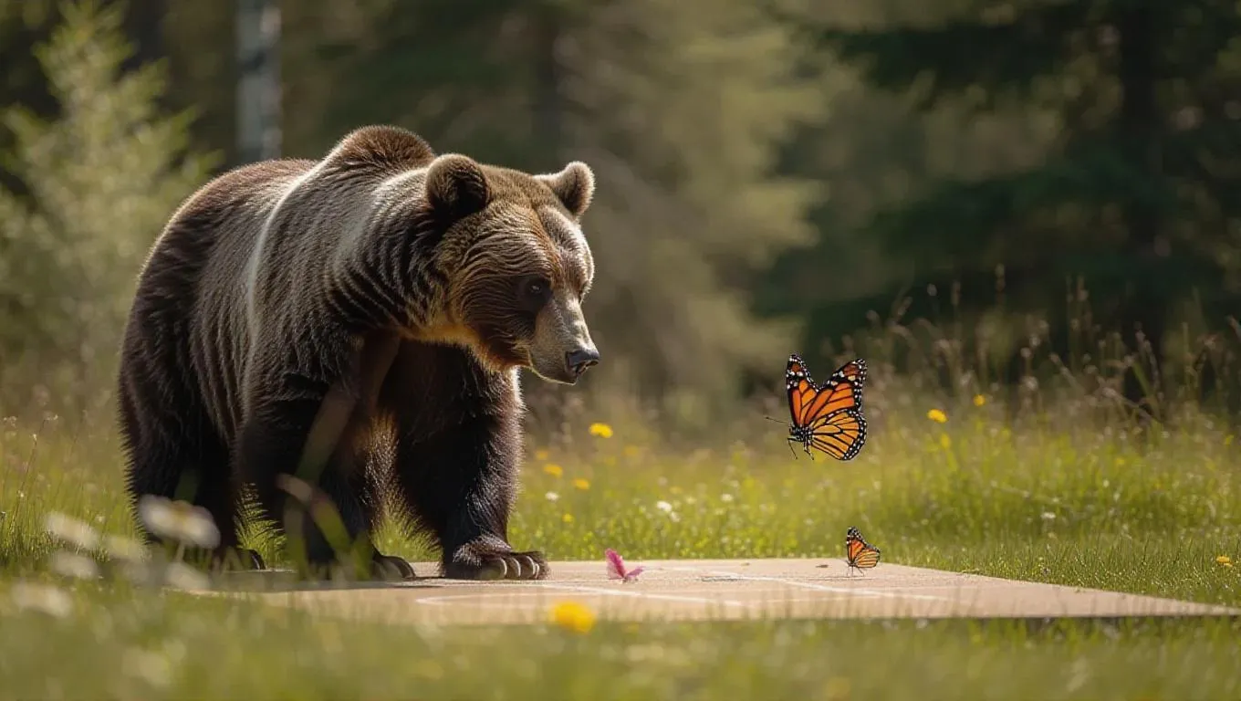 In an idyllic meadow sports arena, a bear and a butterfly are engaged in a friendly game of hopscotch. The bear's large paws allow it to cover ground quickly, while the butterfly flits around gracefully. The beautiful meadow enhances the joyousness of the game between the bear and butterfly.