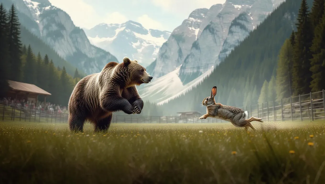 In a misty valley sports arena, a bear and a hare are engaged in a friendly game of running races. The bear's power gives it strong strides, while the hare's speed allows for rapid movement. The enchanting valley backdrop amplifies the thrill of the race between the bear and hare.