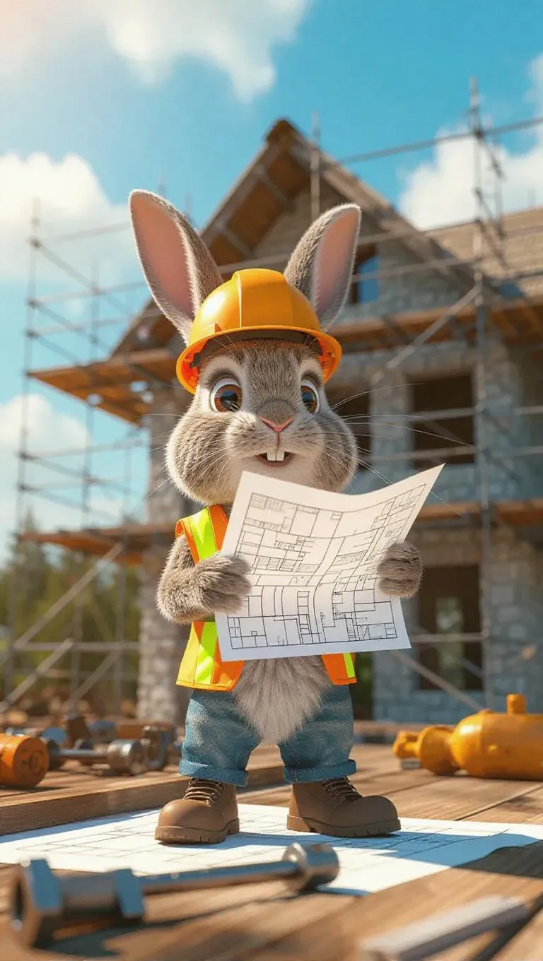 A 3D bunny wearing a construction worker's hard hat and reflective vest, standing upright on two legs, holding a detailed blueprint, surrounded by scaffolding and a half-built house, exuding a hardworking and determined atmosphere, with tools scattered around and a sunny sky in the background.