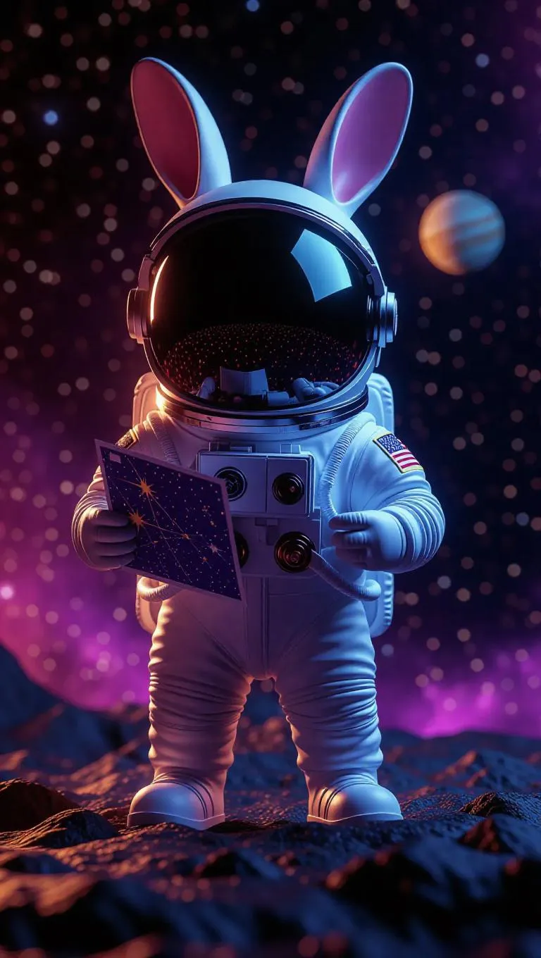 A 3D bunny wearing an astronaut suit and helmet, standing upright on two legs, holding a space map, surrounded by stars and a distant planet, exuding an adventurous and explorative atmosphere, with a dark cosmic backdrop and vibrant galaxies.