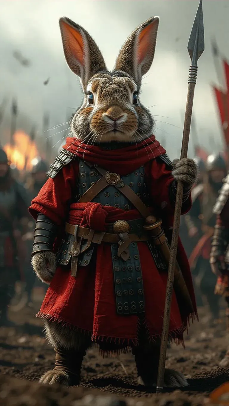 A 3D bunny wearing a historical warrior's attire, standing upright on two legs, holding a spear, surrounded by a battlefield and other warriors, exuding a fierce and determined atmosphere, with smoke rising and an overcast sky.