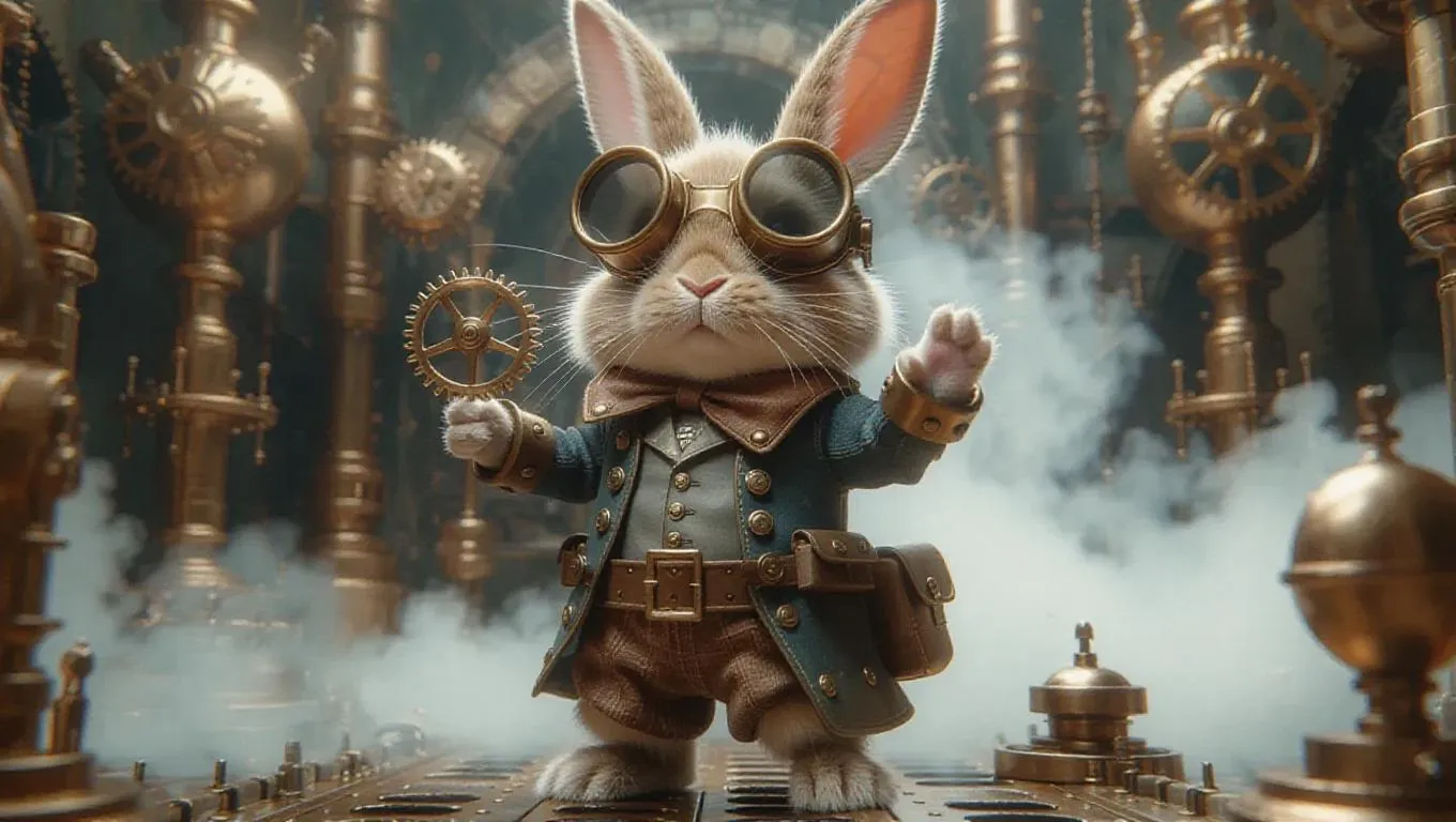 A 3D bunny wearing a steampunk outfit with goggles, standing upright on two legs, holding a gear, surrounded by mechanical contraptions and steam, exuding a creative and adventurous atmosphere, with brass colors and a smoky background.