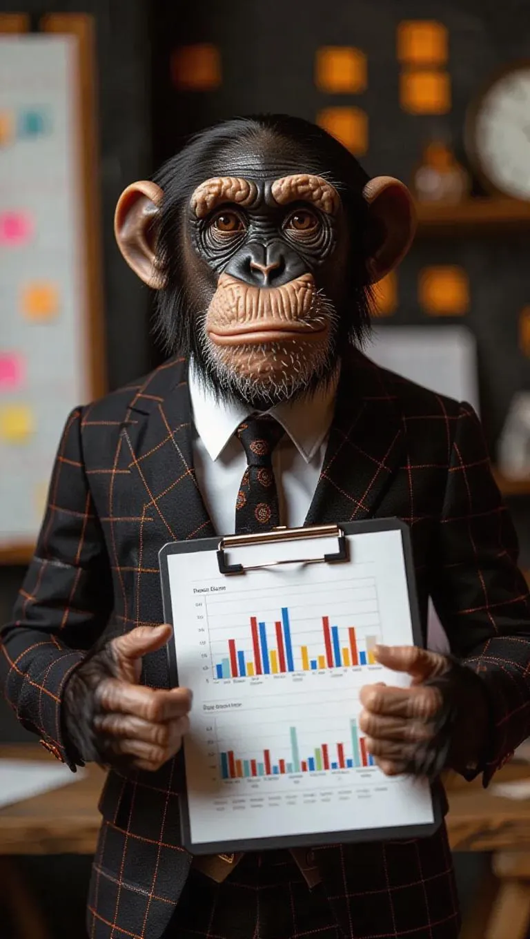 A 3D monkey image wearing a project manager's blazer and a tie, standing upright on two legs like a human, holding a clipboard and pointing at a Gantt chart, surrounded by a whiteboard and a team meeting in progress, exuding a leadership and organized atmosphere.
