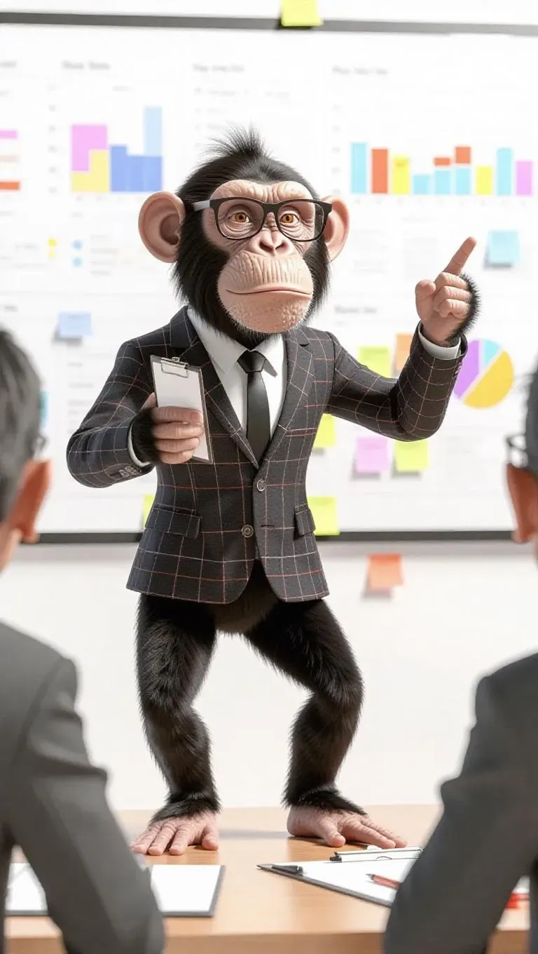 A 3D monkey image wearing a project manager's blazer and glasses, standing upright on one leg in a playful pose, holding a clipboard and pointing at a Gantt chart, surrounded by a whiteboard and a team meeting in progress, exuding a leadership and organized atmosphere.