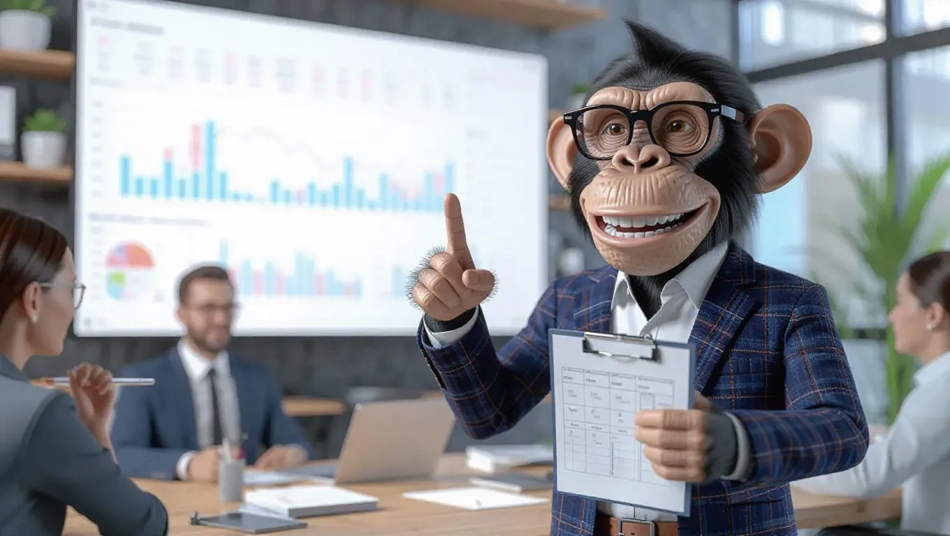A 3D monkey image wearing a project manager's blazer and glasses, standing upright and smiling, holding a clipboard and pointing at a Gantt chart, surrounded by a digital presentation screen and a team meeting in progress, exuding a leadership and organized atmosphere.
