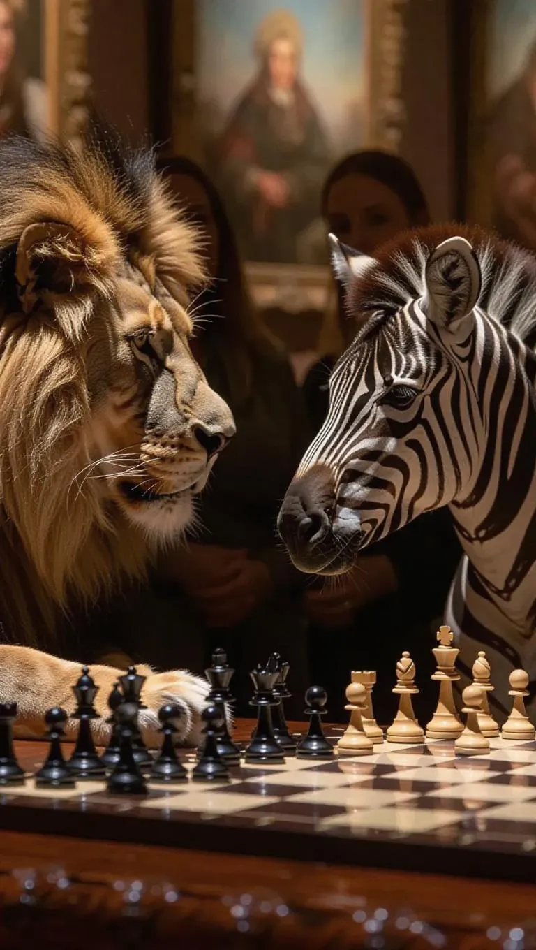 In a quiet art gallery, a lion and a zebra are engaged in a fierce game of chess. The lion uses its intellect to dominate the board, while the zebra's quick thinking allows it to make strategic moves and clever plays. The spectators admire their skills as the two animals compete fiercely, their concentration evident in every glance.