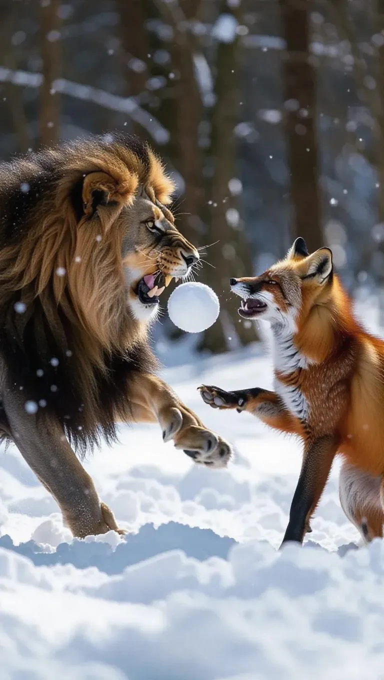 In a snowy landscape, a lion and a fox are engaged in a fierce game of snowball fight. The lion throws with power, while the fox dodges and weaves effortlessly. The snowflakes dance around them as the competition heats up, laughter ringing out.