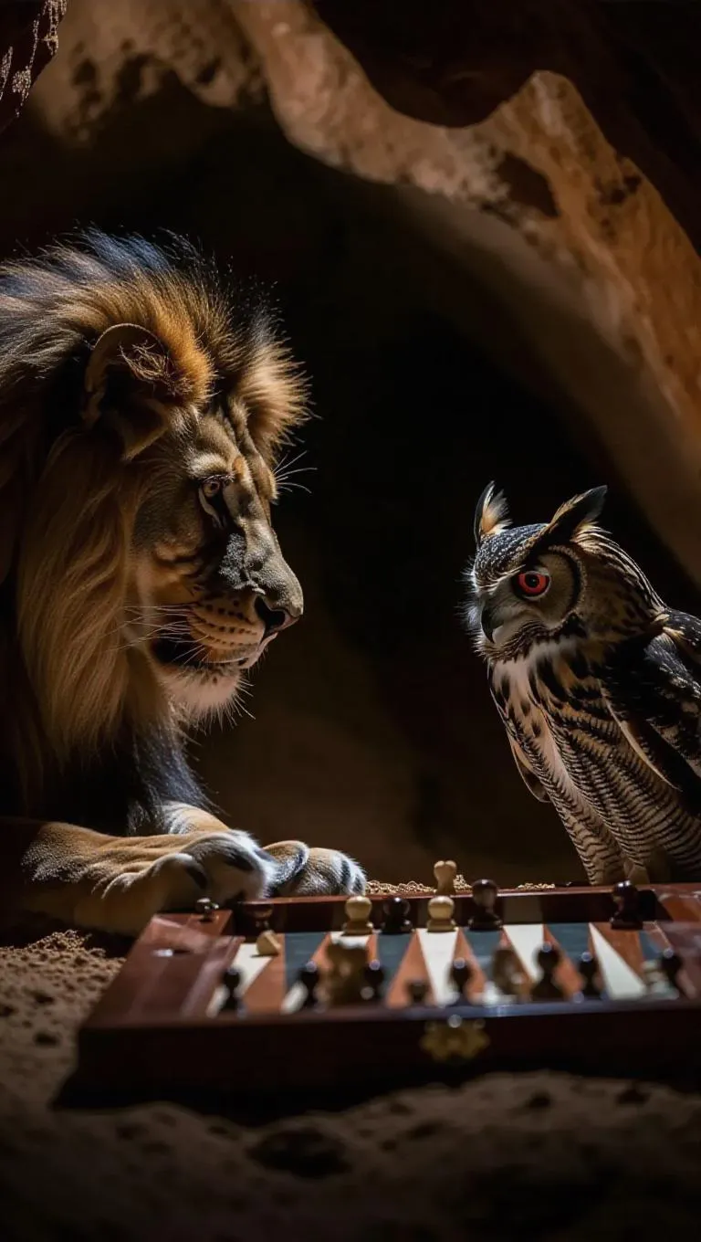In a dimly lit cave, a lion and an owl are engaged in a fierce game of backgammon. The lion focuses intently on the board, while the owl occasionally hoots, strategizing. The atmosphere is tense, as both animals vie for victory in silence.