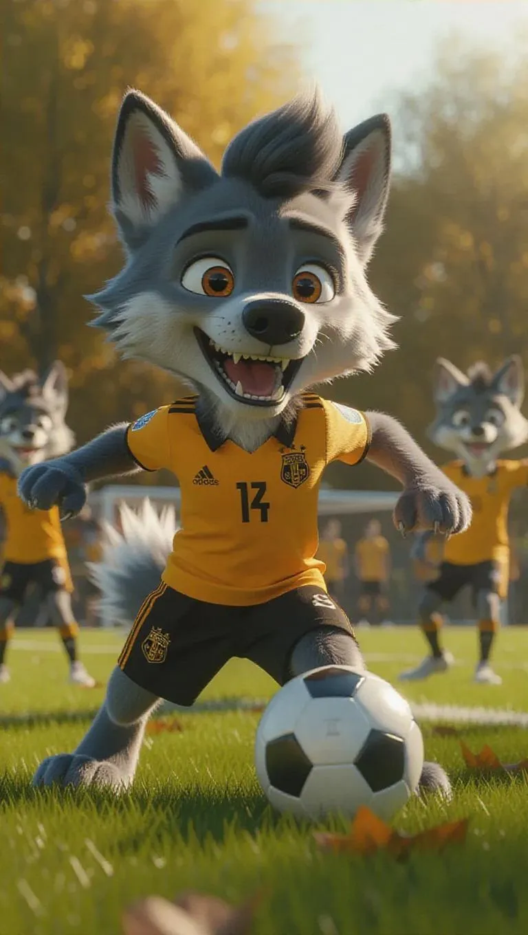 An anthropomorphic gray wolf with amber eyeballs, sporting a pompadour hairstyle and a soccer kit, featuring yellow skin and a joyful expression, captured in stunning 8K resolution, exuding charm and charisma. The scene is set on a soccer field, with the wolf kicking a soccer ball and teammates celebrating nearby.