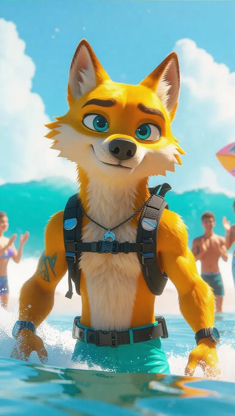 An anthropomorphic yellow wolf with onyx eyeballs, sporting a bald hairstyle and a surfing kit, featuring teal skin and a relaxed expression, captured in stunning 8K resolution, exuding serenity and freedom. The scene is set on a beach, with the wolf catching a wave on a surfboard and friends applauding on the shore.