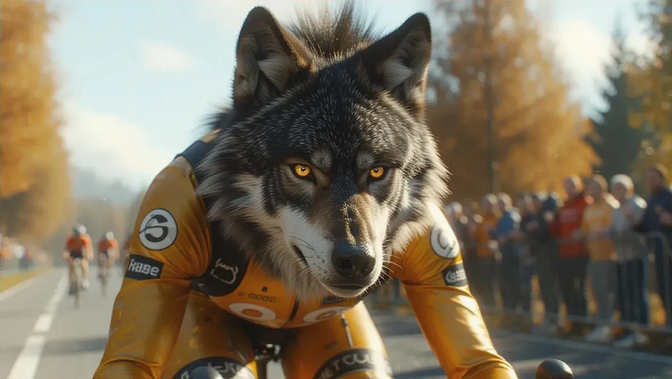 An anthropomorphic chestnut wolf with platinum eyeballs, sporting an afro hairstyle and a cyclist kit, featuring gold skin and an adventurous expression, captured in stunning 8K resolution, exuding speed and agility. The scene is set on a cycling path, with the wolf racing past and fans cheering alongside the route.