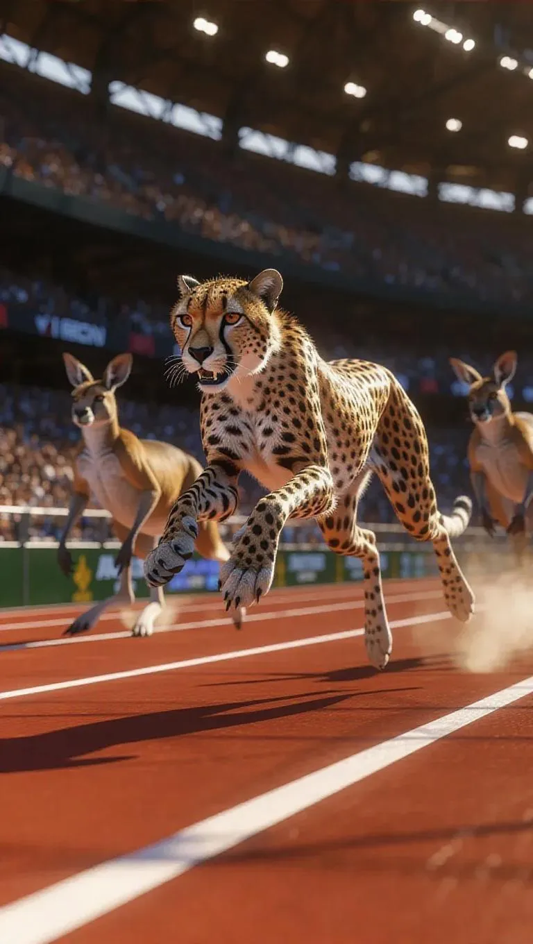In a modern sports arena, a cheetah races on an advanced track, its sharp eyes observing the rivals, while a kangaroo springs over jump bars with impressive skill. The arena's cutting-edge lighting accentuates the thrill of the race between the cheetah and kangaroo.