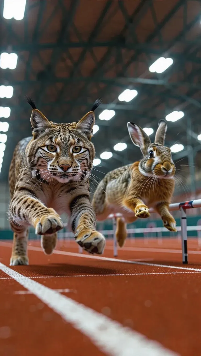Inside a high-tech sports dome, a lynx accelerates on a digital track, its watchful eyes assessing the competition, while a hare vaults over hurdles with remarkable speed. The dome's bright lighting showcases the tension of the race between the lynx and hare.