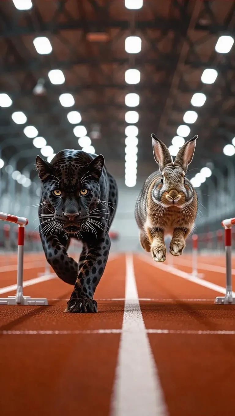 Within a cutting-edge sports facility, a panther sprints on a turbo track, its vigilant eyes tracking the rivals, while a rabbit leaps over jump barriers with phenomenal quickness. The facility's dynamic lighting highlights the fervor of the race between the panther and rabbit.