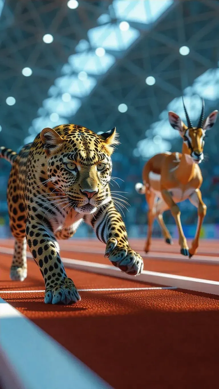 In an ultra-modern athletic dome, a leopard darts on a high-performance track, its focused eyes taking in the competition, while an impala soars over hurdles with breathtaking agility. The dome's vivid lighting portrays the intensity of the race between the leopard and impala.