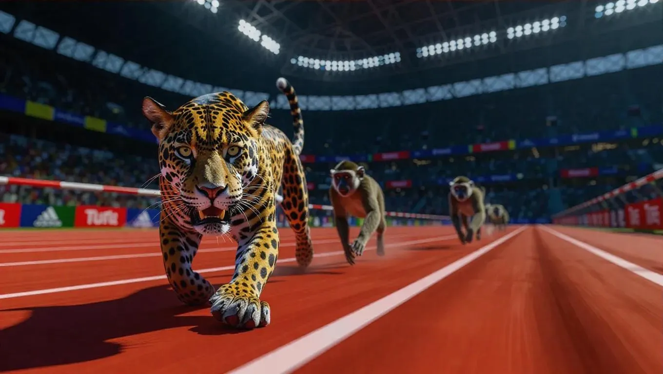 Within a state-of-the-art athletic arena, a jaguar sprints down an ultra-modern track, its sharp eyes fixed on the contest, while a colobus monkey vaults over hurdles with unmatched dexterity. The arena's impressive lighting showcases the excitement of the race between the jaguar and monkey.