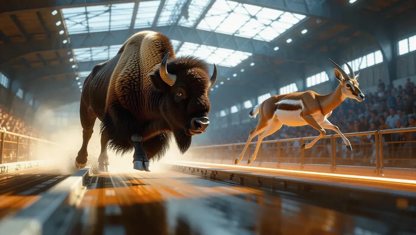 Inside a technologically advanced sports center, a bison charges on a specialized track, its strong eyes scanning the field, while a gazelle soars over barriers with exceptional agility. The center's innovative lighting highlights the excitement of the race between the bison and gazelle.