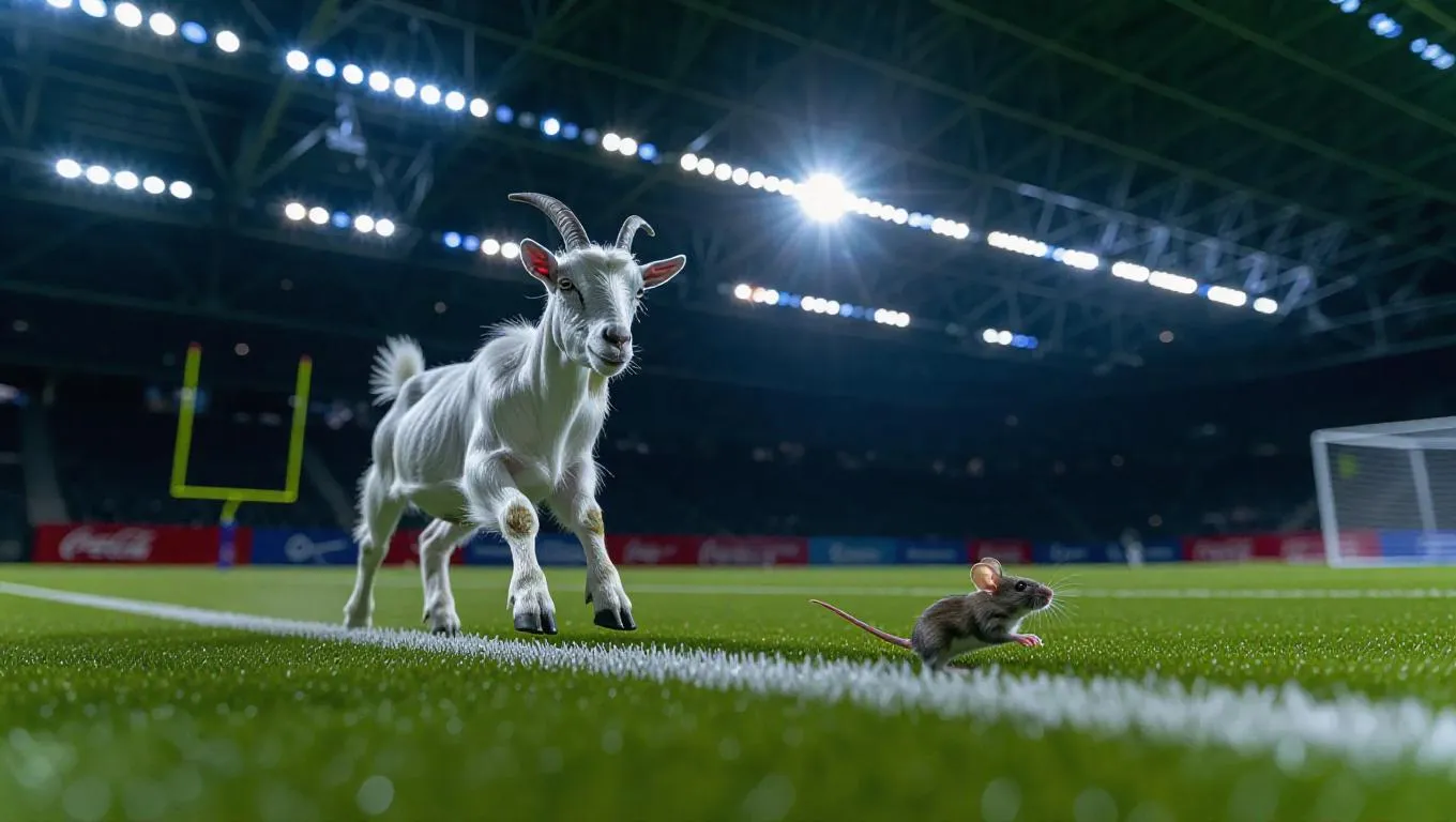 In a next-gen athletic dome, a goat bounds on a state-of-the-art track, its curious eyes scanning the field, while a mouse scurries under jump bars with quickness. The dome's adjustable lighting captures the spirit of the competition between the goat and mouse.