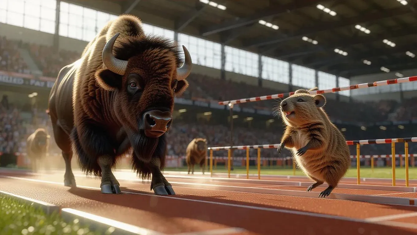 Inside a contemporary sports hub, a bison thunders down a smart track, its powerful eyes on the lookout, while a quokka bounces over high jump bars with cheerful resilience. The hub's ambient lighting brings out the joy of the challenge between the bison and quokka.