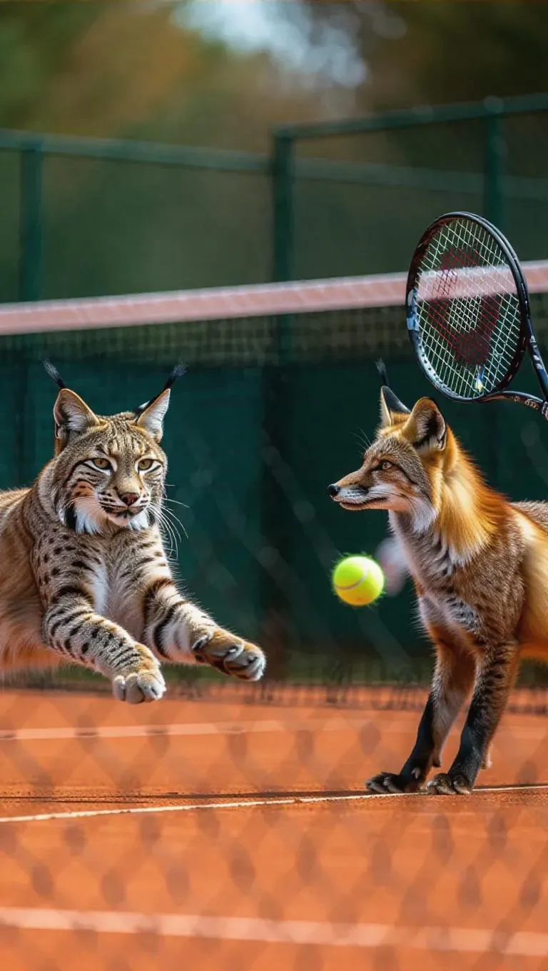 In a spacious tennis court, a lynx and a fox are engaged in an exciting match of tennis. The lynx's sharp reflexes allow it to execute powerful serves, while the fox's agility helps it to chase and return the ball with finesse. The court is filled with the sounds of clapping as the lynx and fox push their limits.