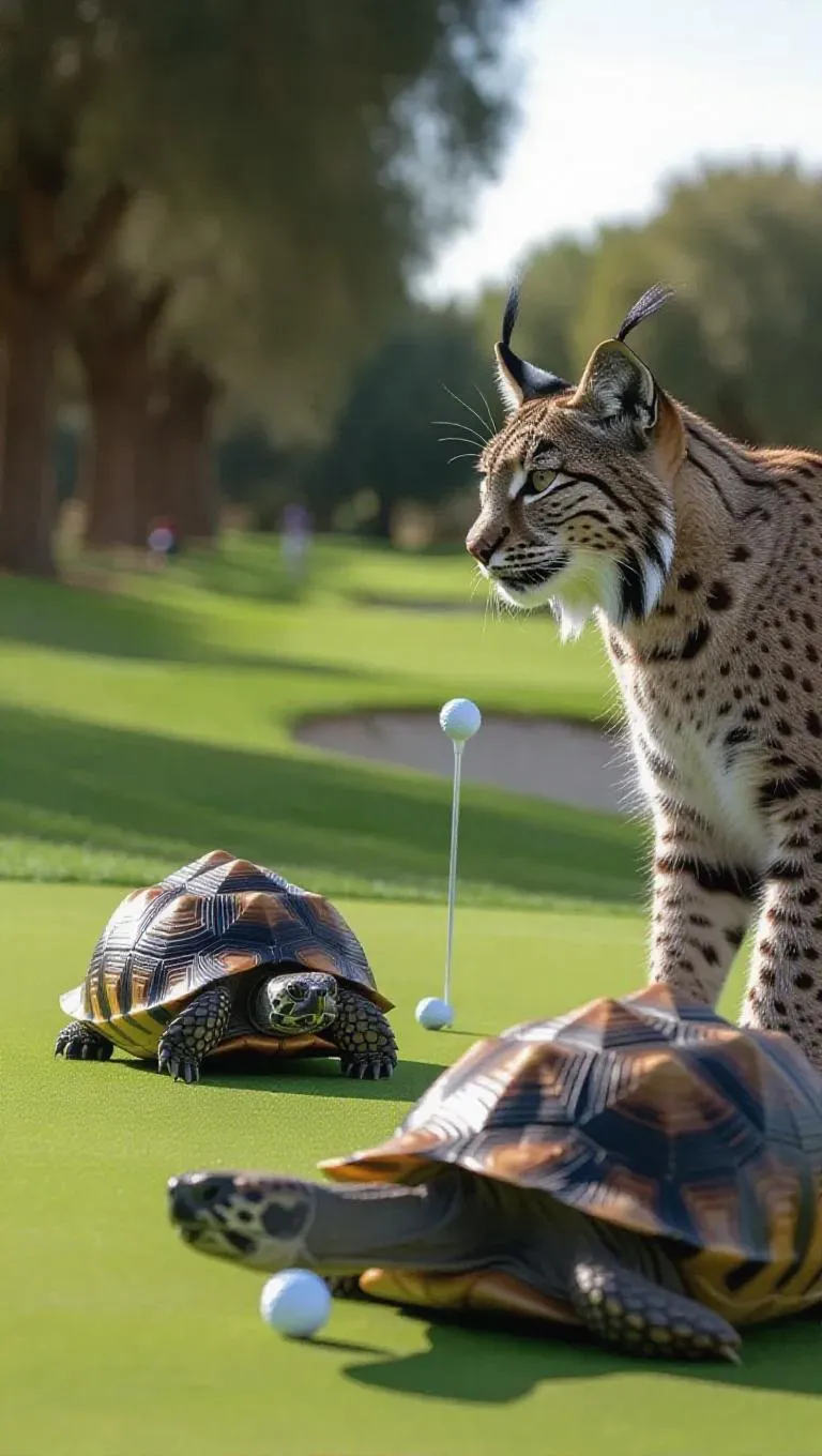 In a lush golf course, a lynx and a tortoise are competing in an unusual game of golf. The lynx's keen eyesight helps it to aim perfectly, while the tortoise's patience allows it to strategize each shot carefully. The course is filled with quiet murmurs as the lynx and tortoise make their moves.