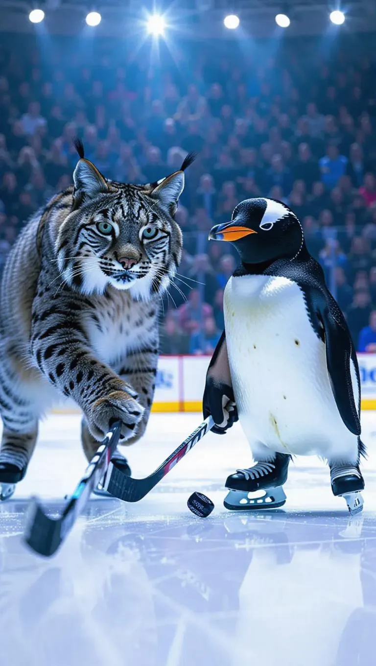 In a cozy ice rink, a lynx and a penguin are taking part in a thrilling ice hockey game. The lynx's agility helps it to skate swiftly, while the penguin's teamwork enables it to pass the puck effectively. The rink is filled with excited chants as the lynx and penguin strive to score.