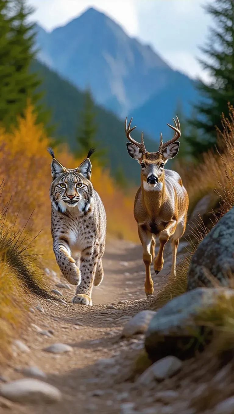 In a scenic mountain trail, a lynx and a deer are racing in a challenging marathon. The lynx's endurance allows it to maintain a swift pace, while the deer’s agility helps it navigate the rocky terrain. The trail resounds with encouragement as the lynx and deer push forward.