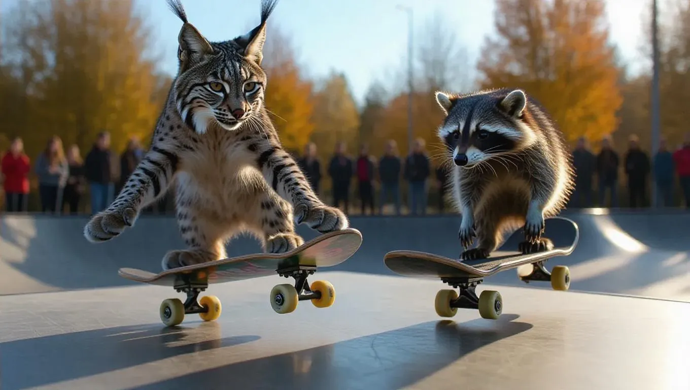 In an impressive skate park, a lynx and a raccoon are performing tricks on skateboards. The lynx's grace allows it to land complicated maneuvers, while the raccoon’s swift moves keep the crowd entertained. The park is alive with applause as the lynx and raccoon show off their skills.