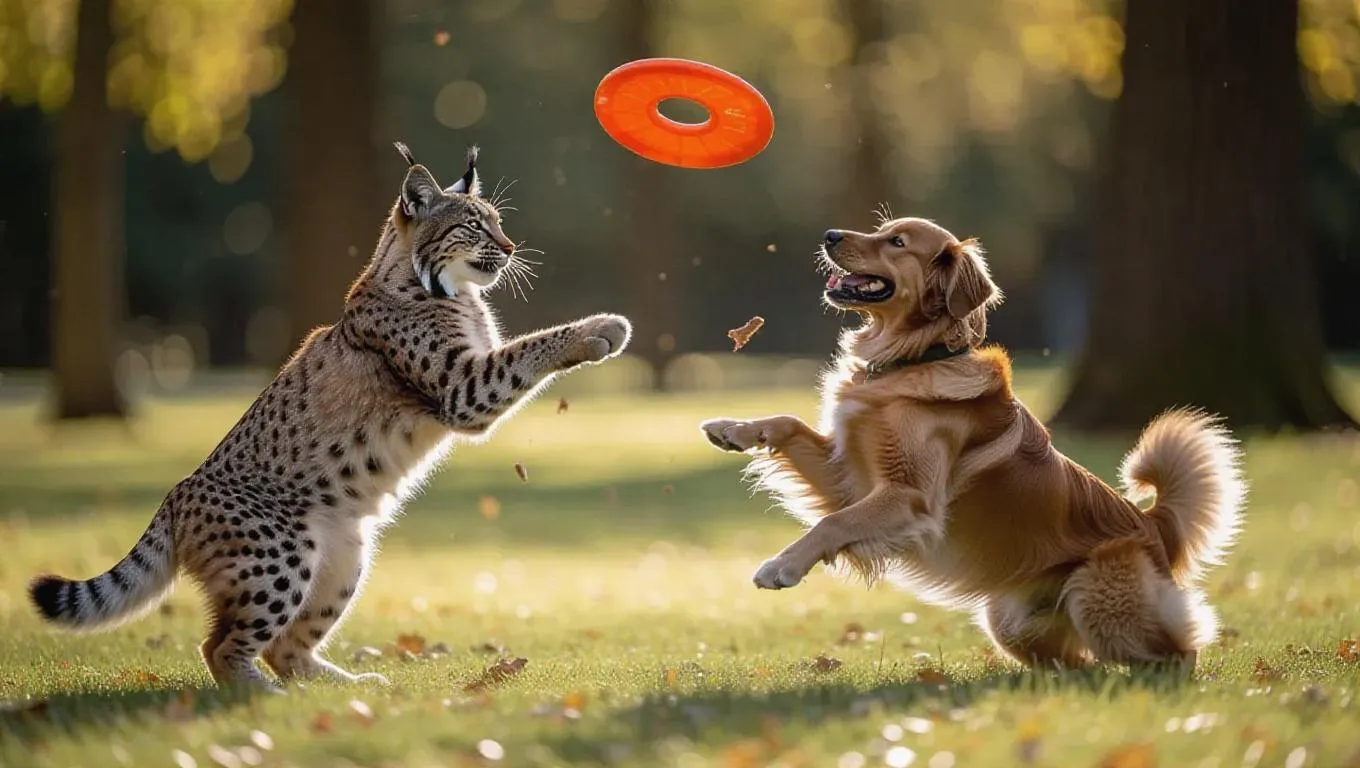 In a scenic park, a lynx and a golden retriever are participating in a playful frisbee competition. The lynx's quick reflexes help it catch the frisbee mid-air, while the retriever's enthusiasm keeps the game lively. The park is filled with laughter as the lynx and retriever enjoy their game.