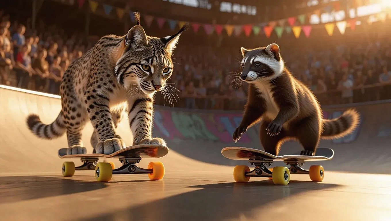 In a vibrant skateboarding arena, a lynx and a ferret are showing off their skills in a skateboarding contest. The lynx's agility allows it to perform difficult tricks, while the ferret’s speed keeps the crowd entertained. The arena buzzes with excitement as the two animals showcase their talent.
