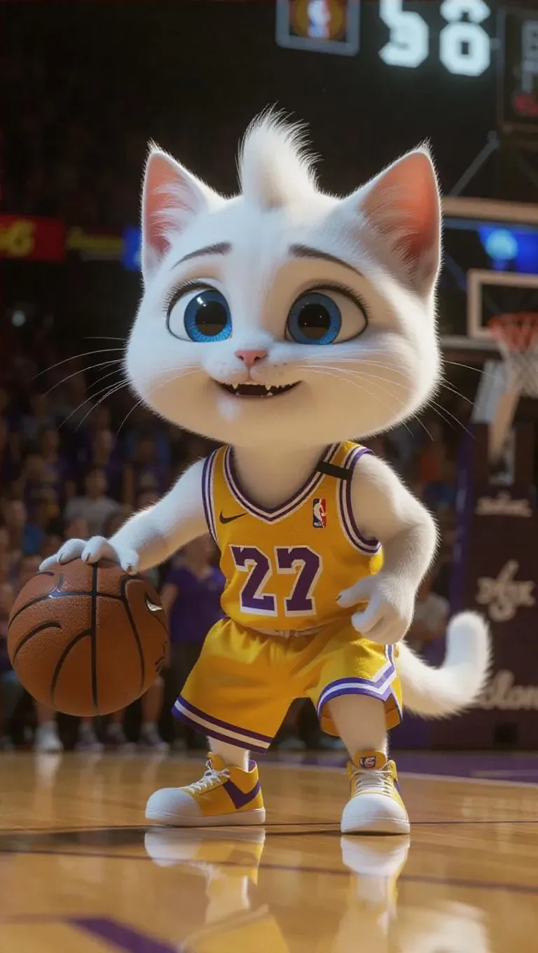 An anthropomorphic white cat with blue eyeballs, sporting a pompadour hairstyle and a professional basketball uniform, featuring yellow skin and a joyful expression, captured in stunning 8K resolution, exuding charm and charisma. The scene is set on a basketball court, with the cat dribbling a basketball and the crowd cheering in the background.