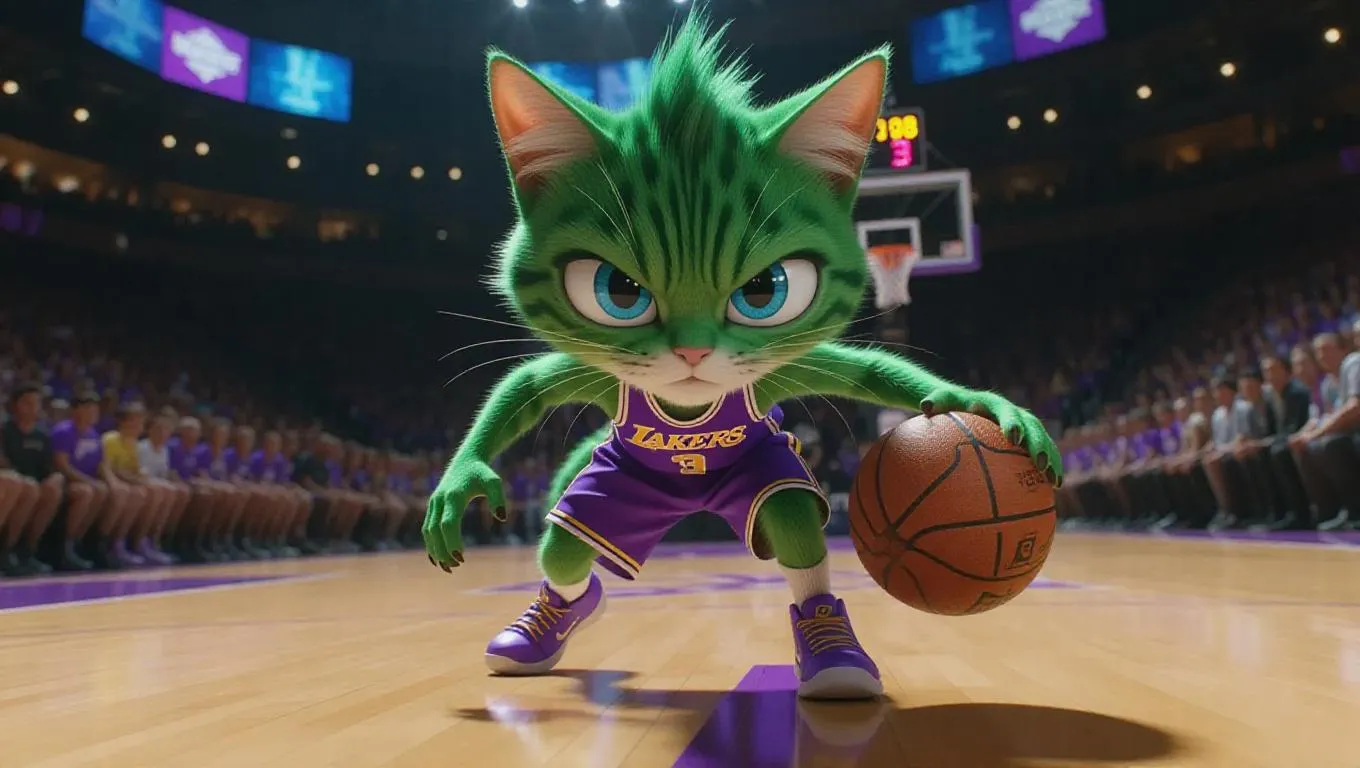 An anthropomorphic chartreuse cat with deep blue eyeballs, sporting a spiky hairstyle and a modern basketball uniform, featuring lavender skin and an intense expression, captured in stunning 8K resolution, exuding focus and drive. The scene is set on an elite basketball court, with the cat dribbling fiercely against an opponent and the crowd roaring in the background.