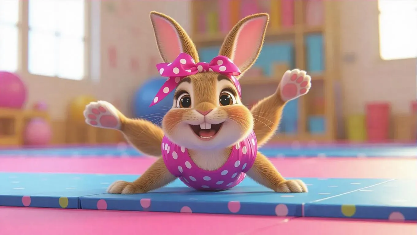 A spirited little bunny tumbles from the floor routine mat, its polka-dot bandana proudly displayed. The bunny wears a bright magenta gymnastics leotard, with fluffy white ears and pink feet. Its eyes glimmer with joy, appearing close to landing gracefully. The background is a lively gym floor, ensuring the focus remains with the bunny. The lighting is energetic and bright, enhancing the vivacious, animated presentation.