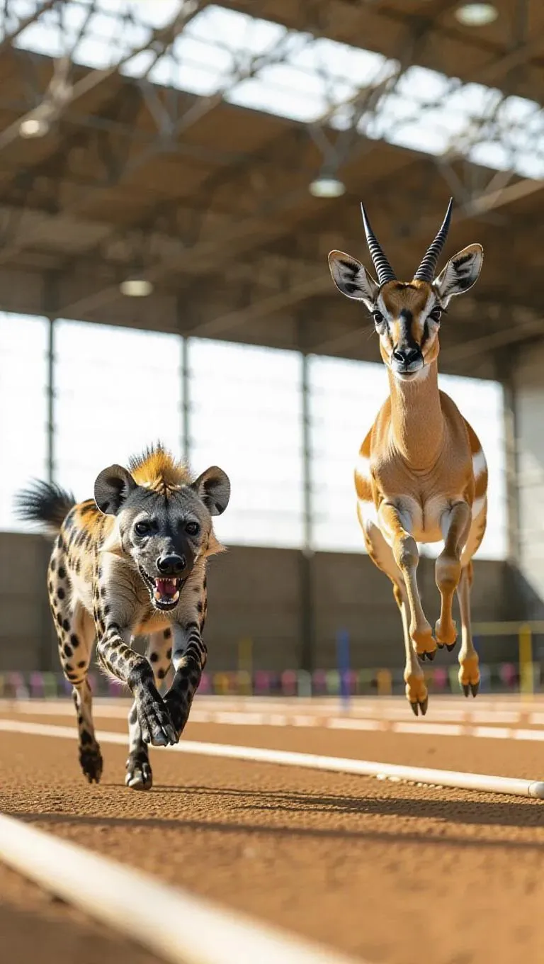 In a modern indoor arena, a hyena sprints on a rubberized track, its laughter echoing through the air, while a gazelle leaps over high jump bars with incredible grace. The contrast between the hyena's wild energy and the gazelle's elegance captivates the audience.