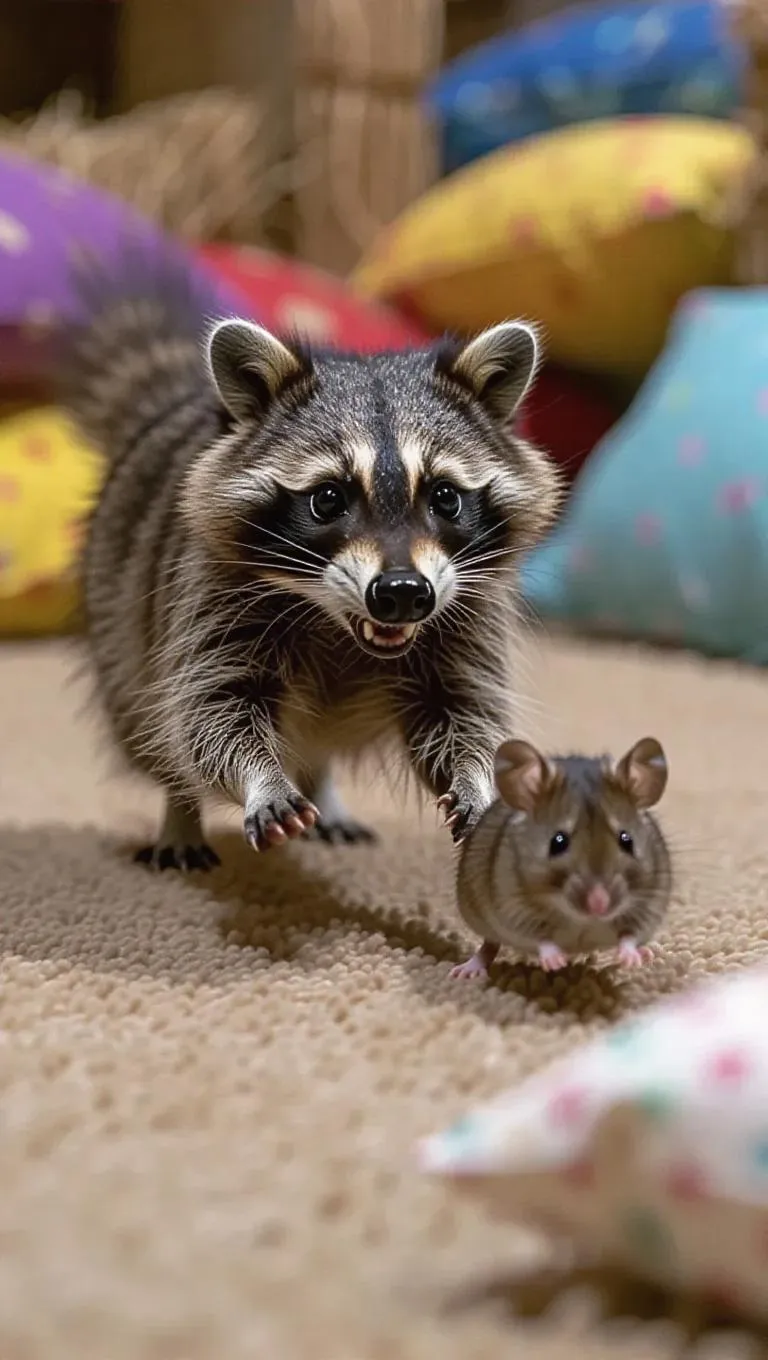 In a whimsical indoor arena, a raccoon sprints on a carpeted track, its chattering echoing through the air, while a mouse leaps over soft pillows with incredible agility. The contrast between the raccoon's mischief and the mouse's quickness captivates the audience.