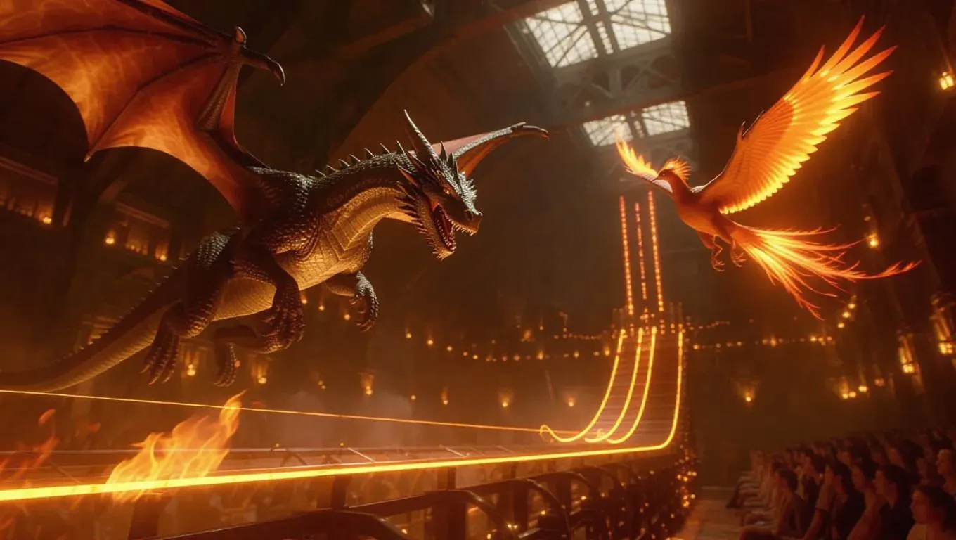 In a mystical indoor arena, a dragon sprints on a glowing track, its roars echoing through the air, while a phoenix leaps over fiery jump bars with incredible flair. The contrast between the dragon's ferocity and the phoenix's beauty captivates the audience.