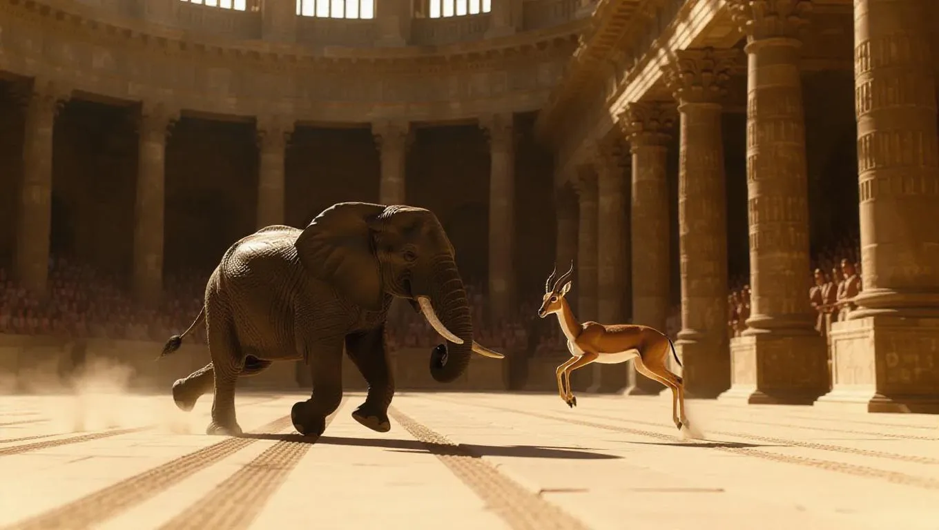 In an ancient indoor arena, an elephant sprints on a stone track, its trumpets echoing through the air, while a gazelle leaps over ancient pillars with incredible elegance. The contrast between the elephant's size and the gazelle's lightness captivates the audience.