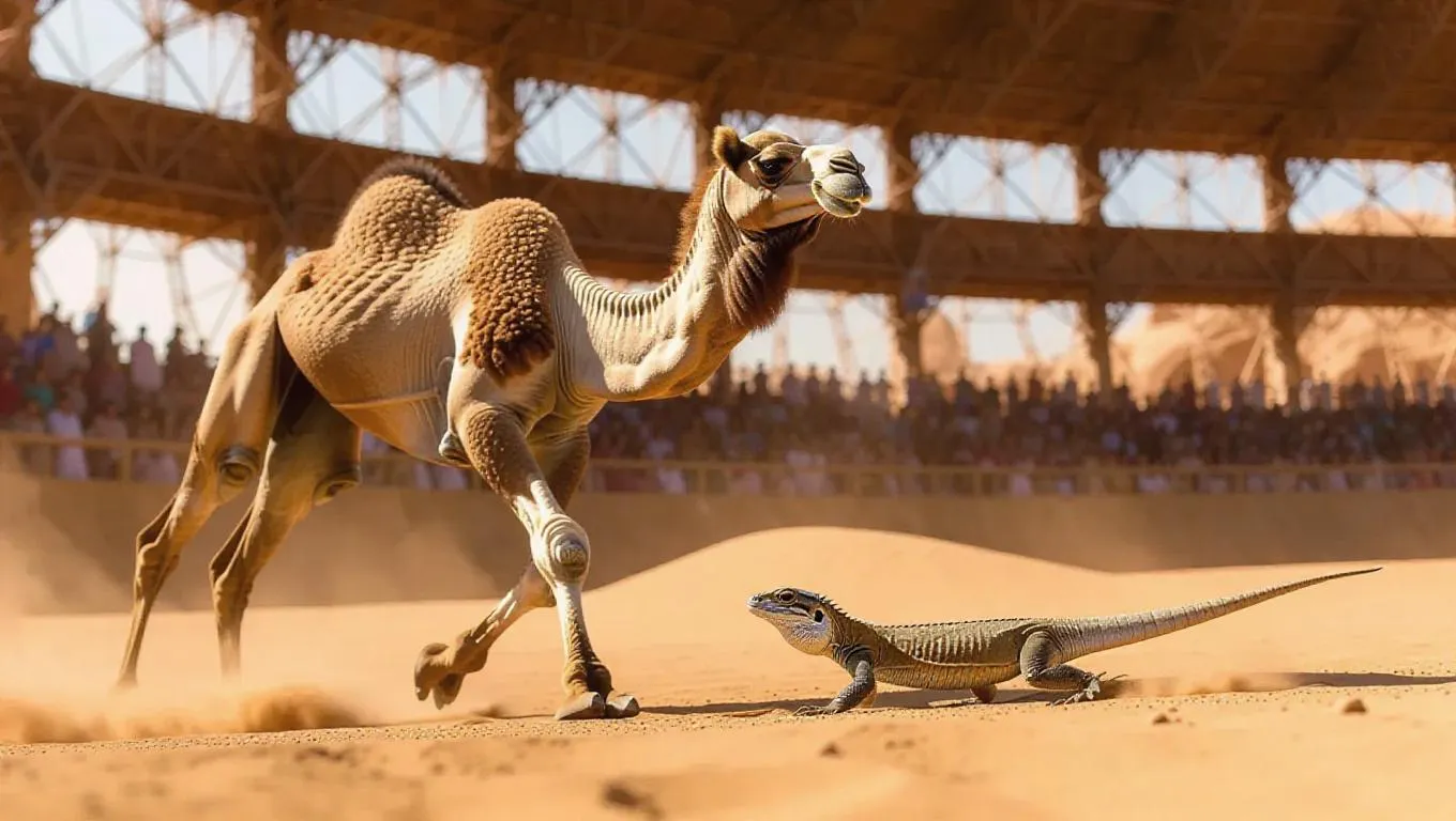 In an arid indoor arena, a camel sprints on a dusty track, its grunts echoing through the air, while a lizard leaps over small dunes with incredible speed. The contrast between the camel's steadiness and the lizard's agility captivates the audience.