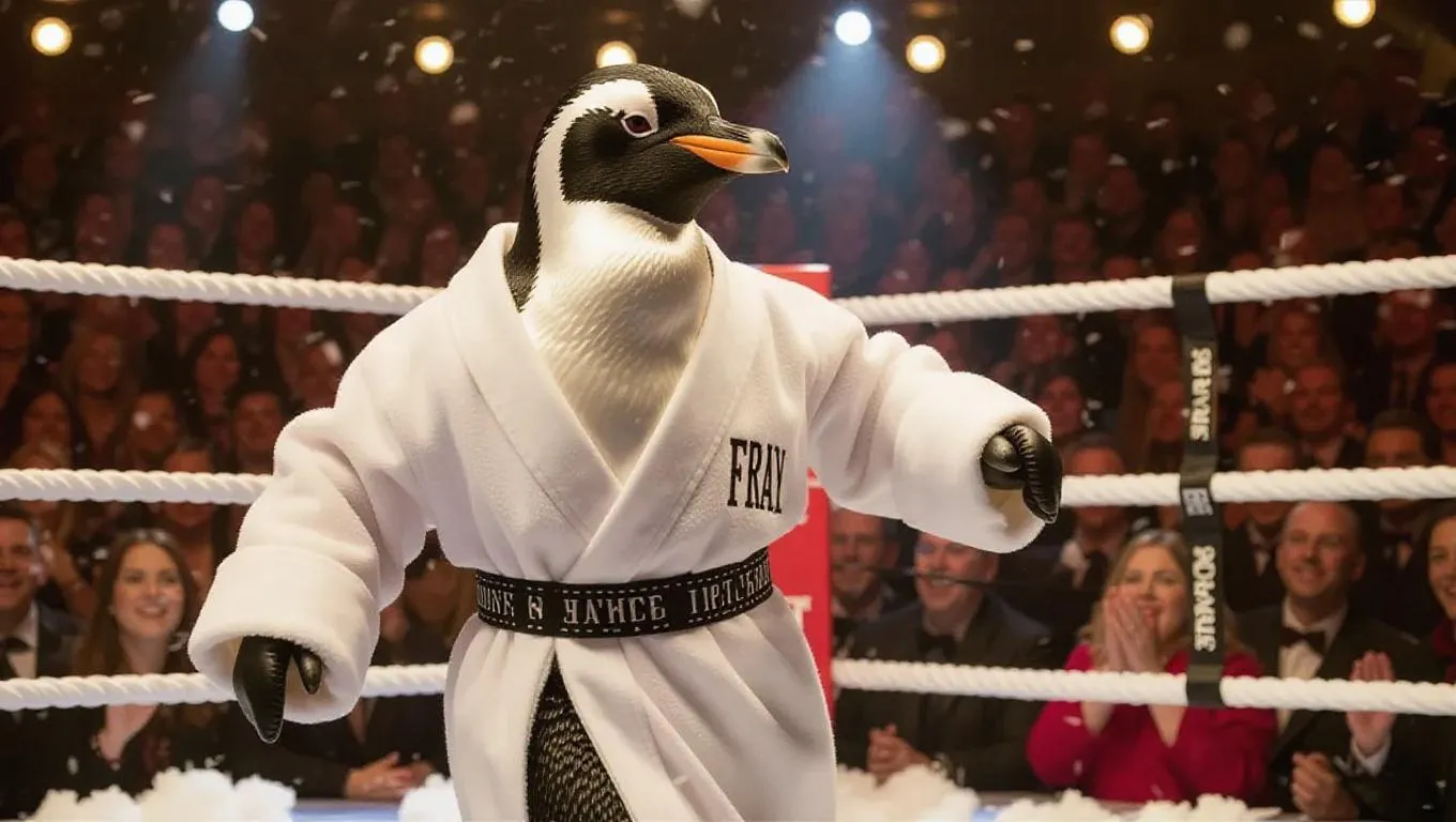 An anthropomorphic penguin gladiator waddles into the Roman arena, now a trendy boxing ring. He dons a chic, tailored boxing robe with his name sleekly printed on the back, showcasing his sturdy demeanor. The audience erupts in laughter and applause as the camera captures his confident waddle and determined expression. Snow billows with each step, and soft highlighting brings attention to his unique form. The atmosphere is jovial, filled with the energy of enthusiastic fans and excitement for the upcoming bout.