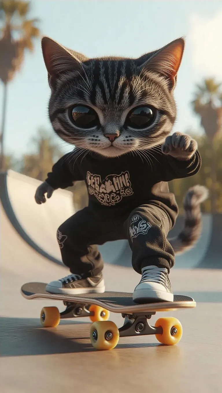 An anthropomorphic grey cat with black eyeballs, sporting an undercut hairstyle and a skateboarding outfit, featuring nude skin and a rebellious expression, captured in stunning 8K resolution, exuding confidence and skill. The scene is set in a skate park, with the cat performing a trick on a skateboard and ramps in the background.
