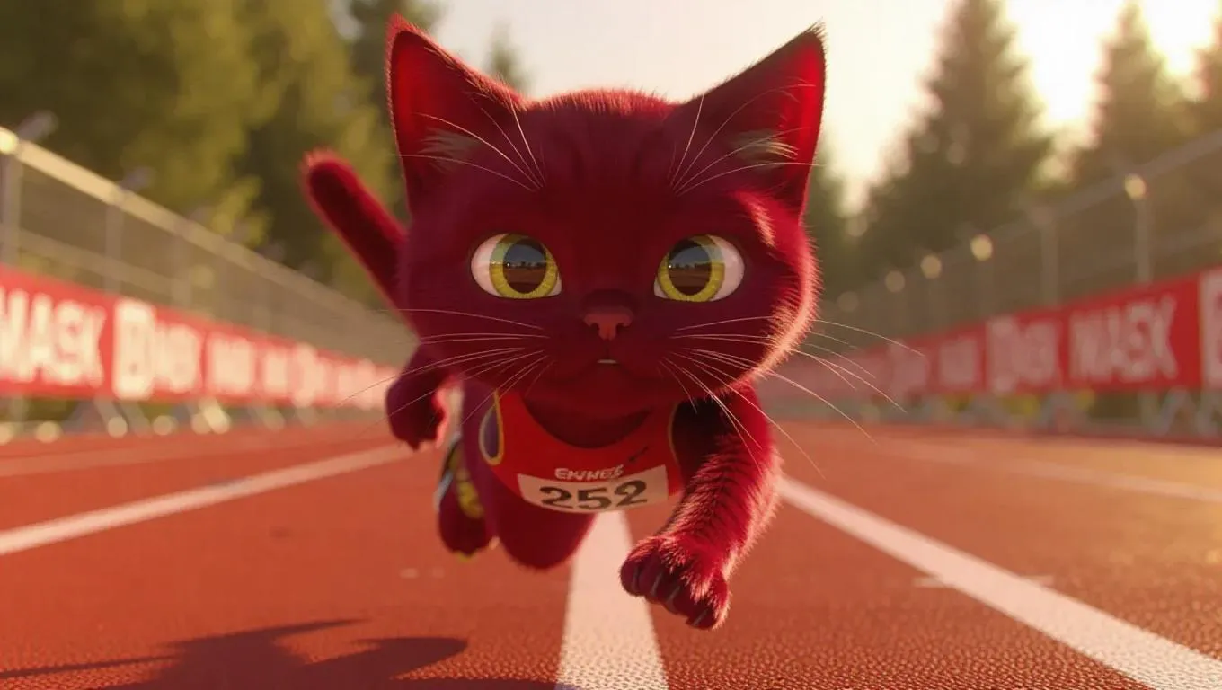 An anthropomorphic burgundy cat with bright yellow eyeballs, sporting a tousled hairstyle and a running outfit, featuring taupe skin and an energizing expression, captured in stunning 8K resolution, exuding speed and determination. The scene is set on a running track, with the cat sprinting and a finish line banner in the background.