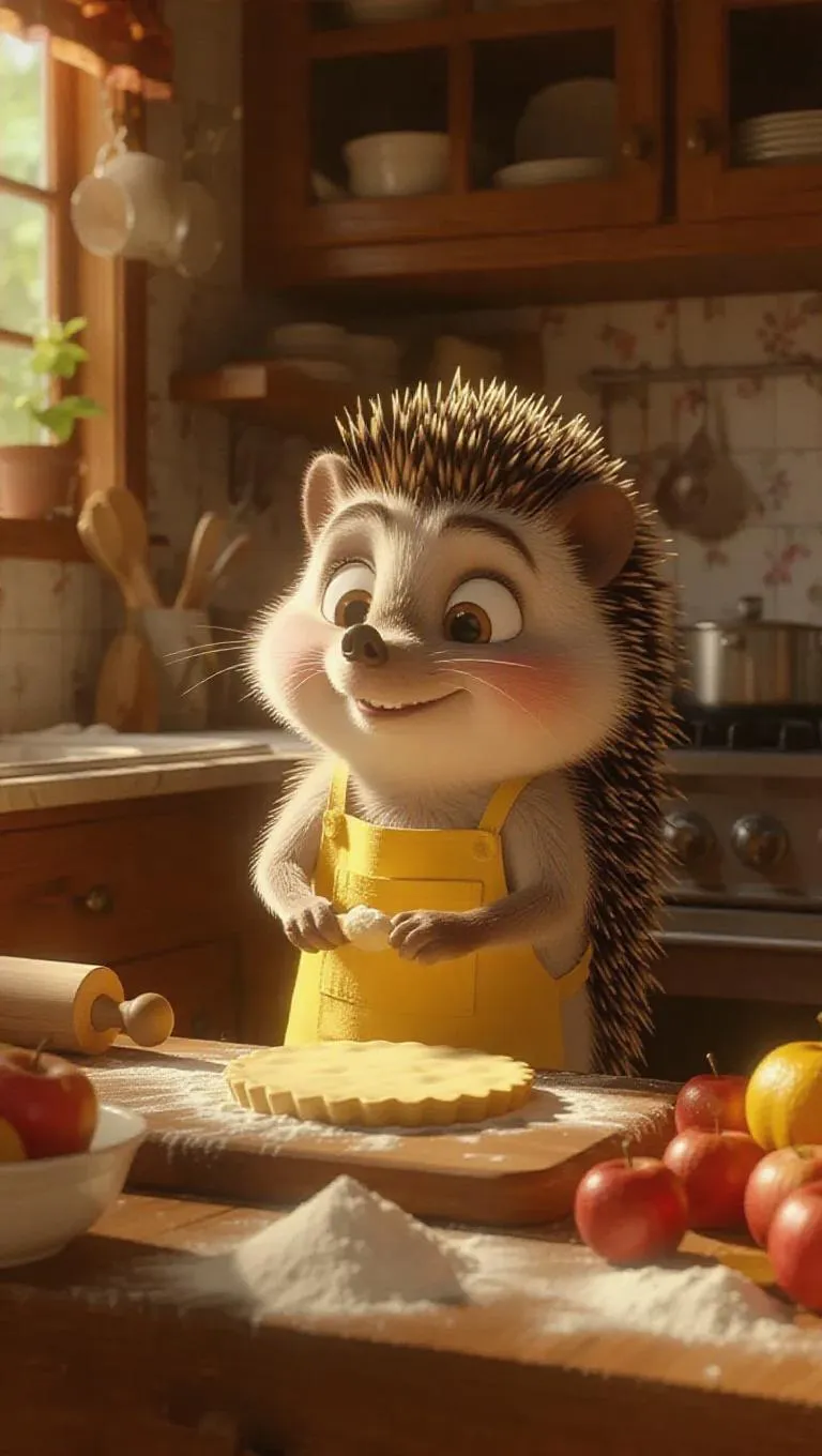 A cartoon hedgehog in a yellow apron, baking pie in a sunny kitchen, using a rolling pin to flatten crust. Surrounded by flour, sugar, and fruit, the hedgehog looks focused and content, with a bit of dough on its nose. Maple cabinets, a small oven, and a pie cooling on a rack. Rolling pins are adorned around, creating a cheerful, bright atmosphere.