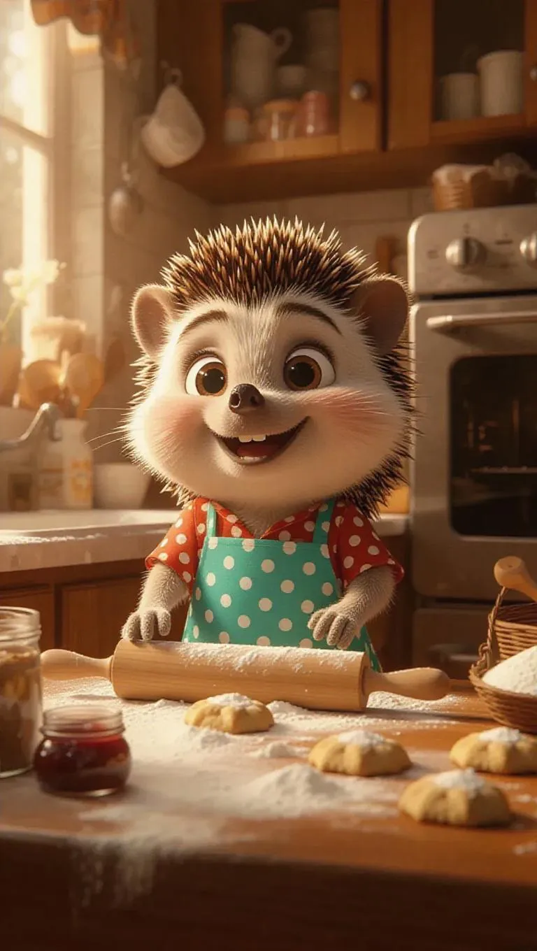 A cartoon hedgehog in a polka dot apron, baking biscuits in a bright kitchen, using a rolling pin to flatten dough. Surrounded by flour, sugar, and jam, the hedgehog looks intrigued and cheerful, with a smear of batter on its nose. Light wood cabinets, a convection oven, and a freshly baked biscuit basket on the table. Baking tools are scattered around, contributing to the friendly, sunny atmosphere.