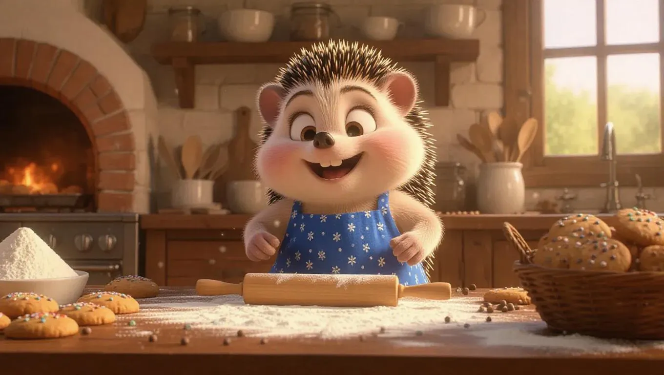 A cartoon hedgehog in a blue-patterned apron, baking cookies in a farmhouse kitchen, using a rolling pin to flatten dough. Surrounded by flour, sugar, and chocolate sprinkles, the hedgehog looks motivated and blissful, with icing dust on its nose. Farm-style cabinets, a brick oven, and a basket of assorted cookies cooling nearby. Cookie implements are scattered playfully, adding warmth to the rustic atmosphere.