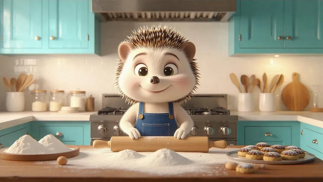 A cartoon hedgehog in a denim apron, preparing cookies in an elegant kitchen, using a rolling pin to flatten dough. Surrounded by flour, sugar, and chocolate drizzle, the hedgehog looks serene and happy, with a touch of flour on its nose. Stylish cabinets, a gas range, and a tray of cookies perched on the island. Utensils are artfully displayed, enhancing the chic, gourmet atmosphere.