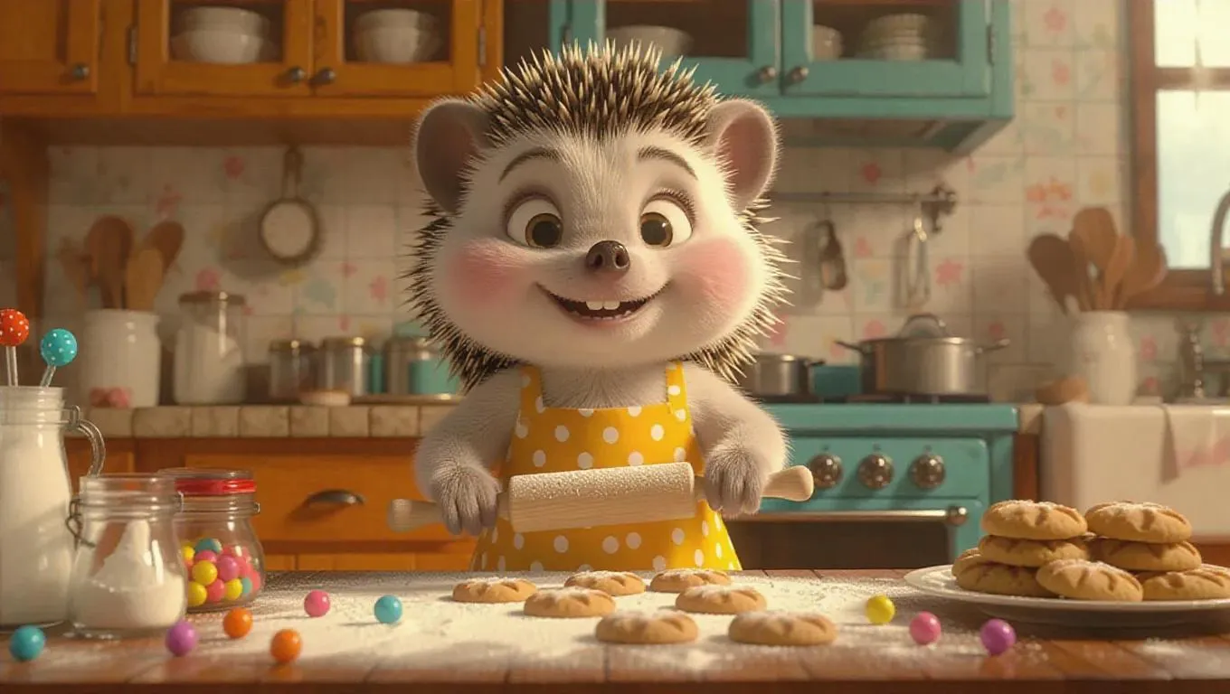 A cartoon hedgehog in a yellow polka dot apron, baking cookies in a nostalgic kitchen, using a rolling pin to flatten dough. Surrounded by flour, sugar, and jellybeans, the hedgehog looks cheerful and entertained, with a dab of frosting on its nose. Retro cabinets, a classic oven, and a stack of cookies cooling on a plate. Cookie cutters are placed decoratively, contributing to the cheerful, vintage atmosphere.