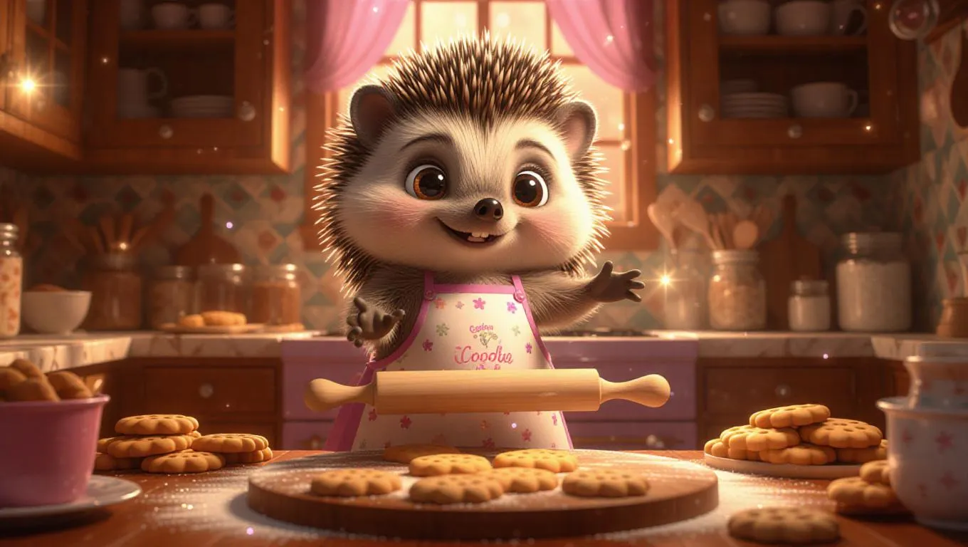 A cartoon hedgehog in a whimsical apron, swapping cookies in a magical kitchen, using a rolling pin to flatten dough. Surrounded by glitter, sugar, and fairy dust, the hedgehog looks enchanted and playful, with sparkles on its nose. Bright cabinets, a fantastical oven, and a floating platter of cookies. Cookie cutters are sprinkled around, adding to the whimsical, enchanted atmosphere.