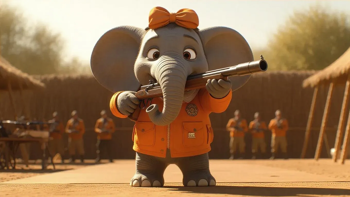 An enthusiastic elephant stands at the shooting line, its brown bow perched atop its head. The elephant wears an orange oversized shooting jacket, with soft gray ears and trunk. It grips a competition-grade bazooka, its eyes locked on the target with unwavering concentration. The background is a safari shooting range, ensuring the focus remains entirely on the elephant. The lighting is warm and earthy, casting no shadows, enhancing the hyperrealistic, Pixar-style rendering.